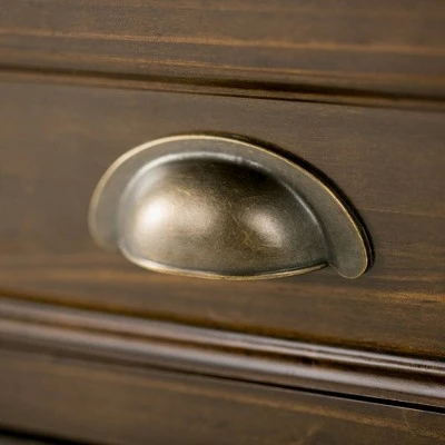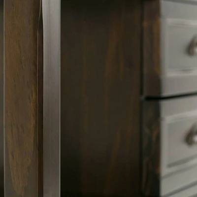 - Transitional design includes rounded molded table top, framed drawers, square and slightly tapered legs and Antique Bronze classic drawer pulls