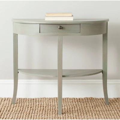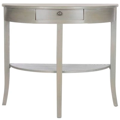 With clean lines inspired by Mission Style furniture, the transitional Alex console by Safavieh adapts to myriad decorating themes. Crafted of Fir in a natural finish, this Demilune table has a handy drawer and shelf for storage. The Alex console is ideal in an entry hall, bedroom or living room and can support up to thirty five lbs. The Alex console table is a great choice for Oriental, Rustic, or Transitional styled areas in your home.