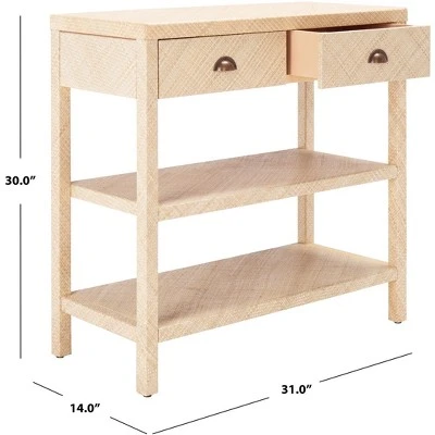 This Apis Raffia Console Table is a favorite of those who love subtle decorative intrigue. Doubling as a bookcase with its two shelves, ApisÕs woven textured look will make you look twice, and a light natural tone seamlessly accents any roomÕs color scheme. The gold pulls on its two drawers adds a hint of glamour. Care Instructions: Dust regularly with a soft, dry cloth. Never use oiled or treated cloths on lacquered finishes. Some finishes can be wiped with a damp (not wet) cloth, followed at once by rubbing with a dry cloth to remove fingerprints and smudges. For persistent spots, gently clean with a soft cloth and a solution of water and mild soap, make sure to wipe dry. Use adhesive felt pads, coasters and placemats to protect your furniture.