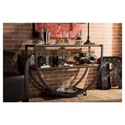 Featuring a rustic reclaimed look, the Blakes console table is constructed of antique black textured finish metal frame and distressed weathered oak finished plank wood board. The U-shaped base of console table is perfect for entryway to hold everyday belongings and cut the clutter in your home. The distressed finish over oak veneer adds vintage casual style for a unique accent console table in a living room, entry way, or dining room. The Blakes will be a standout piece for any home looking to add a touch of refined style. Made in China, the Blakes console table requires assembly. Dimensions: 34″ High x 50″ Wide x 15″ Long; Shelves (Upper): 47″ Wide x 14″ Long; (Middle): 12.2″ High(Between Selves) x 47″ Wide x 14″ Long