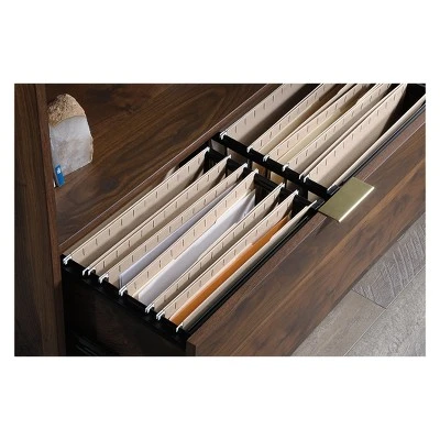 Bring a touch of elegant, mid-century inspired style to your home with this credenza from the Clifford Place collection. This beautiful credenza offers a spacious tabletop surface that provides you with room to display a stylish accent lamp, a decorative clock, and photos of family and friends. Switch it up and use as a TV stand! It accommodates up to a 46″ TV, making it perfect for binge watching all your favorite shows. Its large open shelf provides you with the ideal amount of space to store and display movies, books, bins, and other home dĂ©cor. Behind the door is hidden storage that includes an adjustable shelf for all your additional storage needs. The lower file drawer opens and closes on smooth full extension slides and holds letter or legal size hanging files so you’ll always be organized! It also features cord pass-throughs to keep all your wires neat and out of the way. Finished on all sides in Grand Walnut and accented with solid wood feet and bold brass hardware, this stylish credenza will stand out in any room.