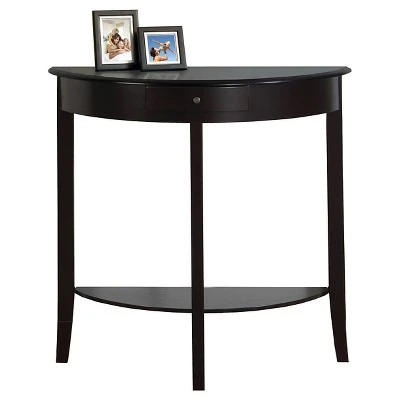A dark cherry finish paired with a brushed silver drawer pull gives this classic Demilune shape a fresh update. The storage drawer will help to keep you organized while the open bottom shelf provides additional storage space or surface space to display your favorite accents. Try adding a decorative basket to the lower shelf creating the ideal place to stow scarves, gloves or hats.