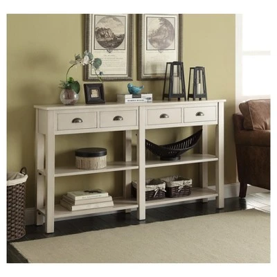 Combine sleek style and space-saving convenience when you add this cream Console Table from Acme Furniture to your collection. Featuring four drawers, a slim wooden frame and two long open shelves at the bottom, this cream rectangle console table easily complements your existing decor with simple design. The long tabletop and open shelves provide plenty of space for decorative pottery, framed photographs, books and more, while the four drawers are great for organizing miscellaneous materials. Place this console table anywhere from your living room to your home office for an elegant interior update.