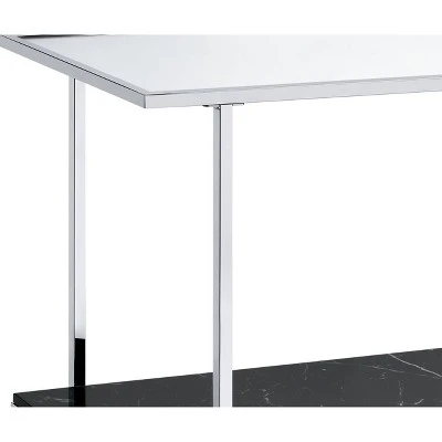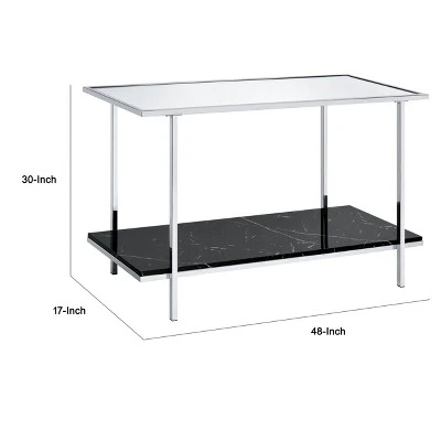 Magnify the beauty of your home with the inclusion of this well designed console table. It features a metal frame in silver finish enchasing a rectangular mirror tabletop and a rectangular open bottom shelf made from faux marble in black finish. It is supported on square metal legs for stability and strength.