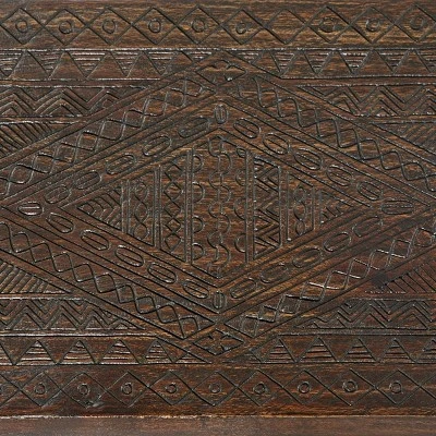 - This dark brown console table accentuates a rectangular top with tall leg stands and Aztec engraved pattern