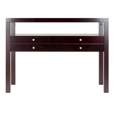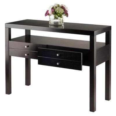 Bring the classic simplicity of Sandinavian design to your entryway, hallway, or dining room with the Copenhagen Console Table. Eye-catching with a lamp or vase in the living room, and practical in the entryway with a basket for keys and gloves near the front door. Use the console to display serveware and keep extra silverware and placemats handy in the dining room. Two drawers with silver satin knob accents provide additional storage. Made of solid and composite wood in a smooth Espresso finish. Overall size is 30″H x 40″W x 17.1″D.