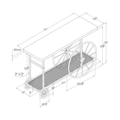 This HOMES: Inside + Out Elena Console Table in Sand Black, Natural Tone features a whimsical and fun design that is great for the living space that doesn’t take itself too seriously. The metal frame of this sofa table has a metal grate bottom shelf and four stationary wheels. The top surface of the credenza has a contrasting light wood surface in a natural finish that looks wonderful with the dark black frame of the HOMES: Inside + Out Elena Console Table in Sand Black, Natural Tone.