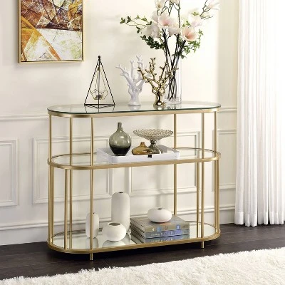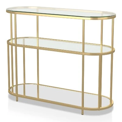 A mix of glass and steel come together with a radiant effect to transform any modern living space in this stunning contemporary console table. The steel frame is fashioned in a lustrous gold coated finish, while each of the top and shelves features tempered glass. The rounded edges of each tier combine with the multiple sleek supports to add a refined element to the overall design.