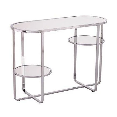 Embrace sleek style with the Aiden Lane Malissa Mirrored Console Table w/ Storage. A metallic frame crisscrosses beneath two round display shelves, crafting glossy shine in an asymmetrical design. The mirrored tabletop and shelves reflect books and art deco décor, while the multifunctional design slides into your entryway or behind your couch. Add a touch of class to your home with this long sofa table serving up party appetizers in your dining room or stacking up family photos and trinkets in the hall.