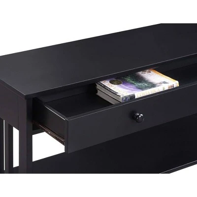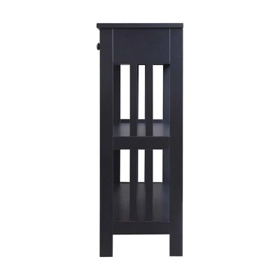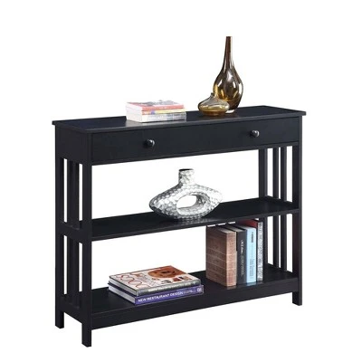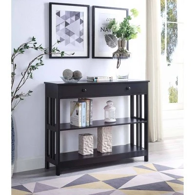 Instantly optimize your storage and display space by bringing home the Mission 1 Drawer Console Table with Shelves by Breighton Home. Offers three ample shelves, enough for all your beloved mementos and one drawer for those unsightly essentials. The drawer is accompanied by roller style metal drawer slides, to help you open and close the drawer smoothly. Do not forget about the signature style side frames, they give this piece its sleek look and contemporary style. Crafted from MDF and finished in a non lead based paint, this accent unit was built for durability. Add to your entryway, hall or living room and enjoy its endless versatility. Allow this furniture to become a staple in your home right after delivery with its simple 9 step assembly. This multifunctional table is available in multiple finishes. Pair with more items from the Mission Collection by Breighton Home. Each sold separately.