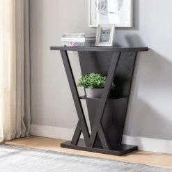 Minimalist and uniquely shaped, this spacious console table will add visual interest to your entryway. Two unique rectangles encase the v-shaped inspired design and one shelf, giving this piece a modern feel. Display your favorite vases or books on the bottom and middle shelves and line the top with fresh flowers on this beautiful table