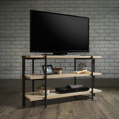 Add a little Rustic elegance and industrial style to your home with this console from the North Avenue collection. It accommodates up to a 42″ TV, perfect for watching all your favorite movies and shows. It features a sturdy, 1″ thick top and shelves to hold video and gaming components, plants, books and more! Finished on all sides with a powdercoated metal frame and Charter Oak finish, this versatile TV stand will look great wherever it entertains.