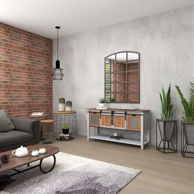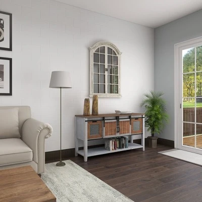 Ample of storage on the top and in each shelving compartments, this large console table will be a great addition to your living room, walkway or entryway. Bring a finishing touch to your home with an inviting appeal with this console table. A sturdy and long lasting construction that for a years of enjoyment. Designed with rubber stoppers at the base that prevent scratching furniture and table tops, as well as sliding around. Item features sliding doors for additional shelve storage that measures 13″L x 10″W. Suitable for indoor use only. Maximum weight limit is 125 lbs. Farmhouse theme.
