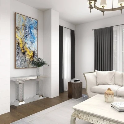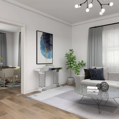 A thick top and base with reflective mirror exterior for an overall balance look with luxurious influence, stunt your guest with this striking piece in your living room or entryway. Bring a finishing touch to your home with an inviting appeal with this console table. A sturdy and long lasting construction that for a years of enjoyment. Suitable for indoor use only. Some assembly required. Maximum weight limit is 100 lbs. Glam inspired.