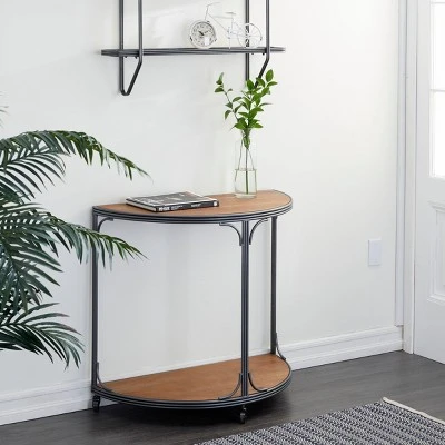- This industrial console table highlights a unique semicircle shape and small round caster wheels
