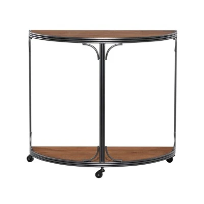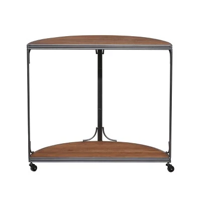 Easy to display and use for storage in parts of the house such as the living room, bedroom and office room. Useful and elegant, console tables are more than just a place to throw your mail. Use it as an accent piece in the living room, library, bedroom, waiting areas, or hallways of you home. This item comes shipped in one carton. Features rolling caster wheels for smooth movement. Suitable for indoor use only. A brown console table with caster wheels that can support up to 100 lbs. A brown semicircle console table with 2 wooden shelves. Industrial theme