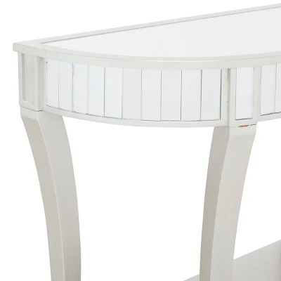 Get organizing with this half circle console table and add a dash of sparkle to any of your home spaces. Useful and elegant, console tables are more than just a place to throw your mail. Bring a finishing touch to your home with an inviting appeal with this console table and mirror set. Designed with rubber stoppers to prevent scuffing and sliding. This item comes shipped in one carton. Wooden table is detailed with mirror overlay and furnished with a flat bottom shelf. Suitable for indoor use only. Glam inspired. Maximum weight limit is 100 lbs.