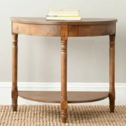 Inspired by elegant Georgian architecture, this Randell Console is a stately addition to the hall or entry. Randell embraces its regal roots with a demilune silhouette and timeless turned legs, while a firewood finish makes it perfect for any classic contemporary decor. Care Instructions: Dust regularly with a soft, dry cloth. Never use oiled or treated cloths on lacquered finishes. Some finishes can be wiped with a damp (not wet) cloth, followed at once by rubbing with a dry cloth to remove fingerprints and smudges. For persistent spots, gently clean with a soft cloth and a solution of water and mild soap, make sure to wipe dry. Use adhesive felt pads, coasters and placemats to protect your furniture.