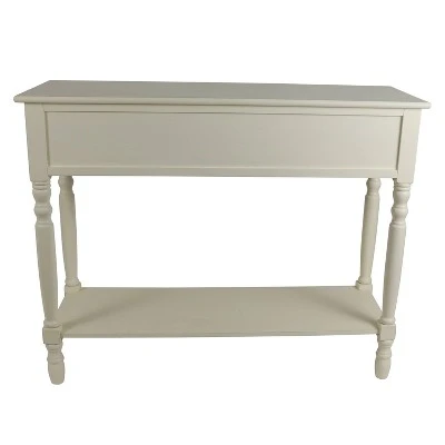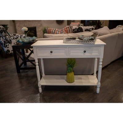 Design and functionality meet in harmony to create the Simplify Shutter Drawer Console Table. This rectangular console table can bring style and functionality to living room, entryway or dining room. The simple, clean lines lend a modern feel, while the turned legs add a traditional element, creating a transitional, timeless look. Two large shutter style storage drawers keep clutter out of sight and provide ample storage space to keep your home organized. Place this sofa table behind a couch for extra storage in the family space, under a wall mounted television to create a sophisticated look or top it with a table lamp and catch all basket in the foyer. The lower shelf doubles your storage capabilities and is ideal for housing baskets, magazines or books. Constructed of wood solids and MDF for long lasting durability. Measures 37×13.75×29.5″