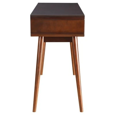 Complement your mid-century decor aesthetic with the storage and display space of the Walnut White Sofa Table from Acme Furniture. Tapered legs add retro flair as it supports a dark wood tabletop, offering stunning contrast against the two white drawers. This beautiful wood sofa table provides the perfect addition to your entryway or living room, adding extra hidden storage in the two drawers or space for displaying your favorite decor on the spacious top.