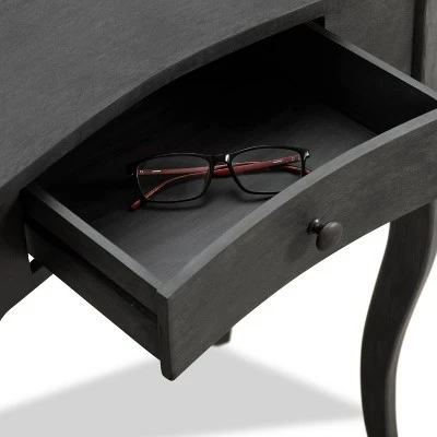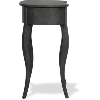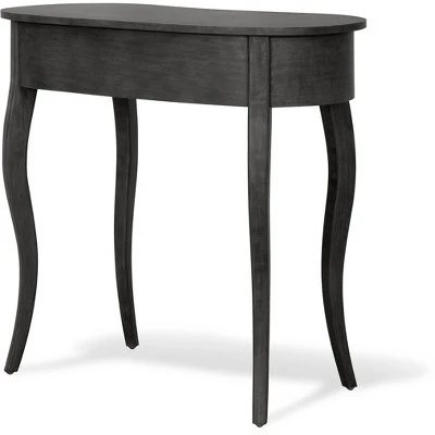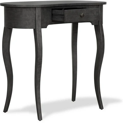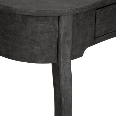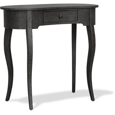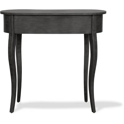 Make a statement in your living room or entryway with this charming and versatile console table. The classic design style ensures this piece always has a place in your home. Available in a sophisticated dark gray finish that’s sure to impress. The timeless curved wood legs of this design will never go out of style. Enjoy its economical and great looking wood construction. The decorative antiqued hardware is as striking as it is durable. With a distinctive oval table top for a timeless and stylish look.