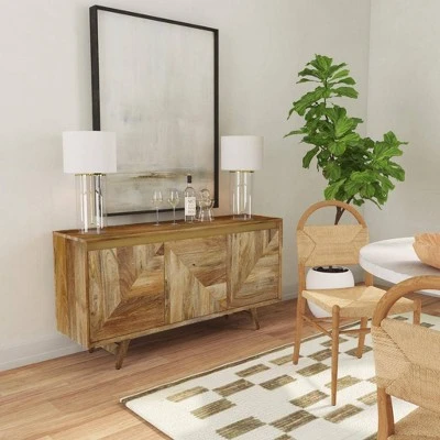 Striking knots and grain patterns in the mango wood of this console come to life in geometric cuts that pair wonderfully in both traditional and contemporary decor settings. 4 shelves support up to 45 lbs each, offering generous storage for dinnerware, electronics, or any other items you’d like to keep tucked away but readily accessible. Measuring at 58” L X 16” D X 30” H, this piece is perfect as a tv stand or extra storage in your dining room, entryway or bedroom.