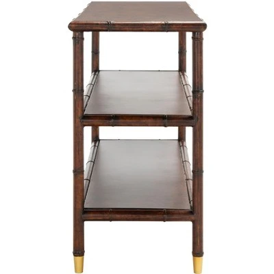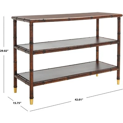 This Tudor Console table reinterprets antique Chinoiserie elegance for todayÕs classic-contemporary interiors. A bamboo-inspired dark brown wood frame is further enhanced by the intriguing, flowing wood grain, while gold steel caps make Tudor a modern heirloom. Two shelves provide ample storage and display. Care Instructions: Dust regularly with a soft, dry cloth. Never use oiled or treated cloths on lacquered finishes. Some finishes can be wiped with a damp (not wet) cloth, followed at once by rubbing with a dry cloth to remove fingerprints and smudges. For persistent spots, gently clean with a soft cloth and a solution of water and mild soap, make sure to wipe dry. Use adhesive felt pads, coasters and placemats to protect your furniture.