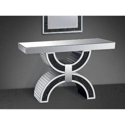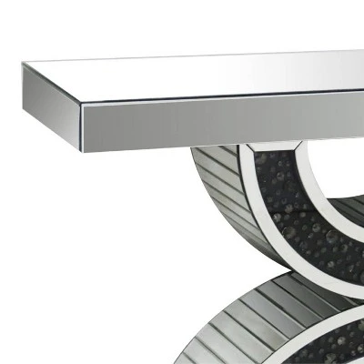 A geometric style base and clear acrylic panels filled with black faux crystals ensures that this Console will be the crowning jewel of your home. The table is constructed from durable Composite Wood materials and it is fully lined with beveled mirrors that reflect light and your modern design aesthetic. Add this Console table behind your sofa to bounce light around your room or place it in your entryway right by the front door so you can handily drop your keys at the end of a long day. Note: Other featured items in image except this Console table are sold separately.