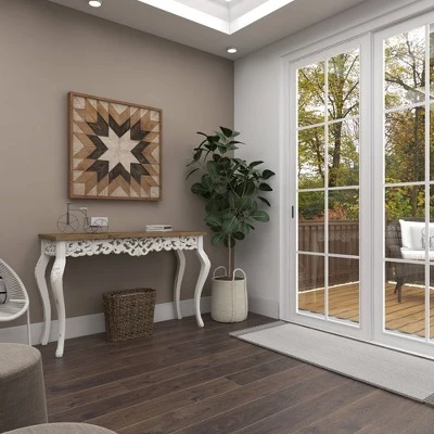 This farmhouse style inspired design white birch wood carved console table will set a great first impression when displayed in entryways with matching Decor. Bring a finishing touch to your home with an inviting appeal with this console table. A sturdy and long lasting construction that for a years of enjoyment. Suitable for indoor use only. Some assembly required. Maximum weight limit is 75 lbs. Farmhouse theme.