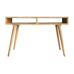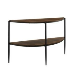 This rustic style console table is a valuable addition to any room whether to place it in an entryway or living room. Showcasing half moon silhouette and incorporates a spacious tabletop with a scalloped design apron that gives it a traditional appeal. It features 2 spacious shelves that are perfect for storing books and baskets while designer turned legs provide stability and sturdiness. Due to the handcrafted nature of the product, there may be variations in color, finish, wood grain and knots.
